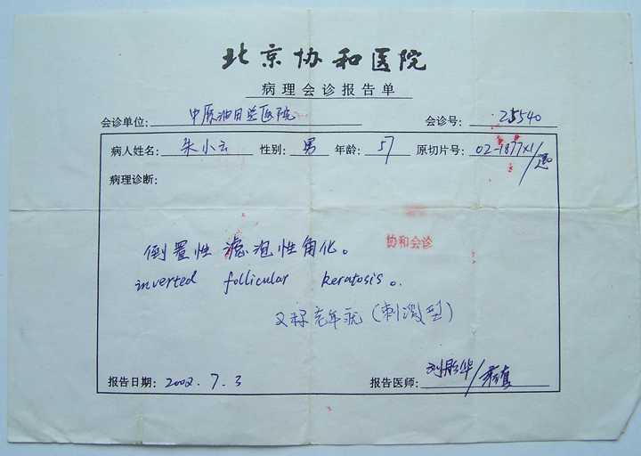 北京协和医院的病理报告是“倒置性滤泡角化,又称老年疣(刺激型)”。