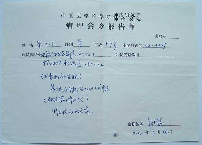 中国医学科学院肿瘤研究所的病理报告是“基底细胞乳头状瘤”。