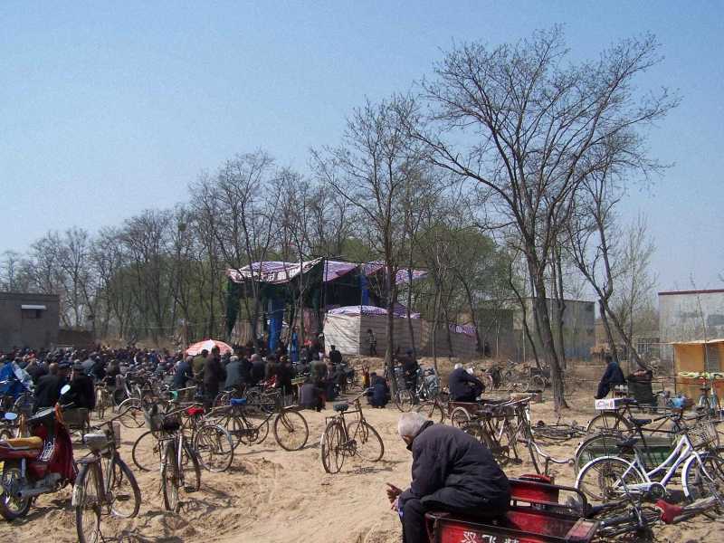 【 三月三班枣庙会。楼高了沙岗平了。一路的摩托车将妻携雏赶庙会。桃花开了,染得满树满坡的粉红,杏花谢了,杏枝上缀出了点点青绿的嫩芽。奔波生存的父老乡亲乐意来庙会上歇心聚首。桑柘影斜春社散,家家扶得醉人归。