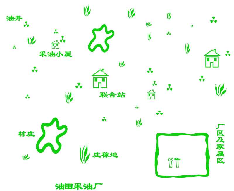 输油输气的管道全是埋在地下,地面上看不见。油井散布在庄稼地里,厂区家属区安插在村庄之间。